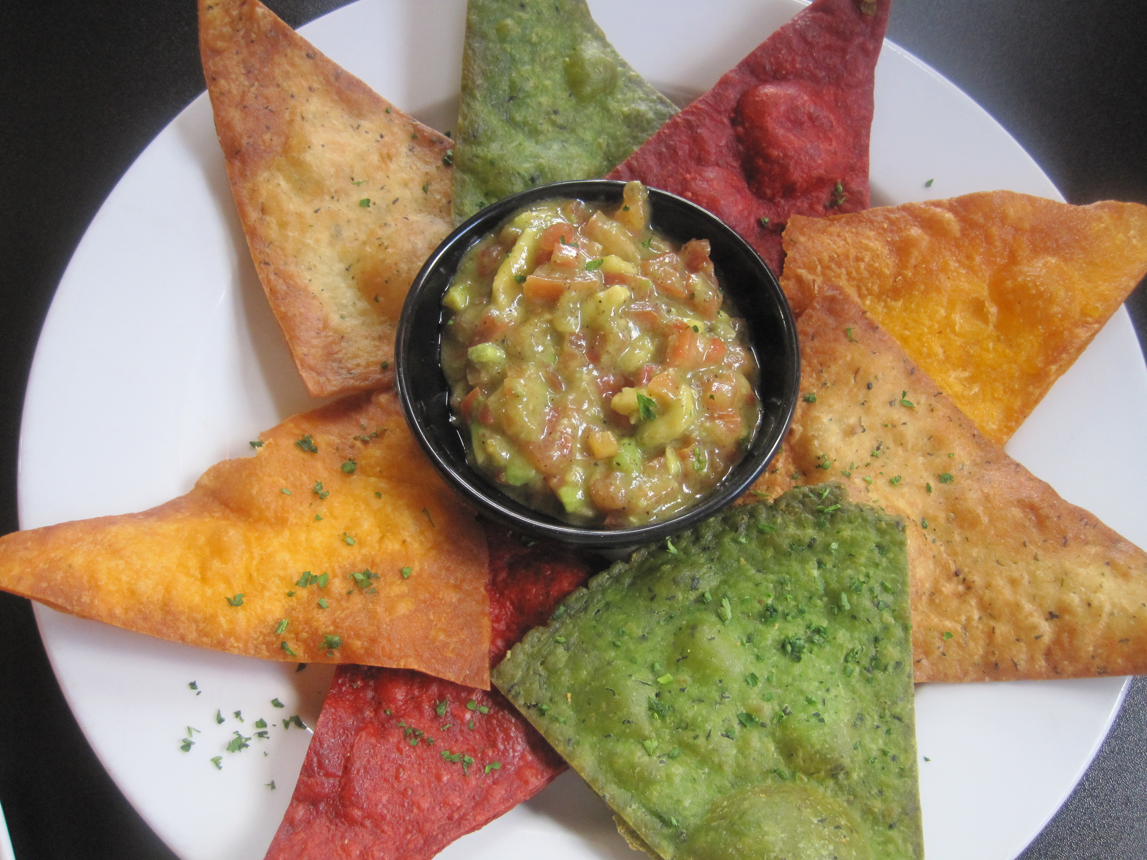 Started with an old favorite: Tri-Colored Chips With Avocado & Tomato Salsa…Lightly fried sun-dried tomato, cheesy jalapeno and herb garlic tortillas that have just the right amount of crunchiness without being hard or dry – to dip in the creamy, bright and “not too hot” avacado & tomato salsa. Love it every time!