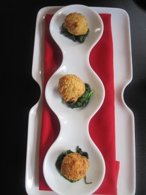 As an appetizer, we just had to have crab cakes…This incredibly beautiful dish is called Bistro Crab Pearls! Small luscious bundles of joy – crab cakes perched on a little nest of fresh sautéed spinach…They first win you over with the inventive artistic presentation – but then when the flavors hit your palate with its rich creaminess and slight crunch when you bite into these little treasures, your knees get weak! The contrast between the sweet bechamel sauce in the crab cake and the savory sautéed spinach was divine…Sinply delicious!