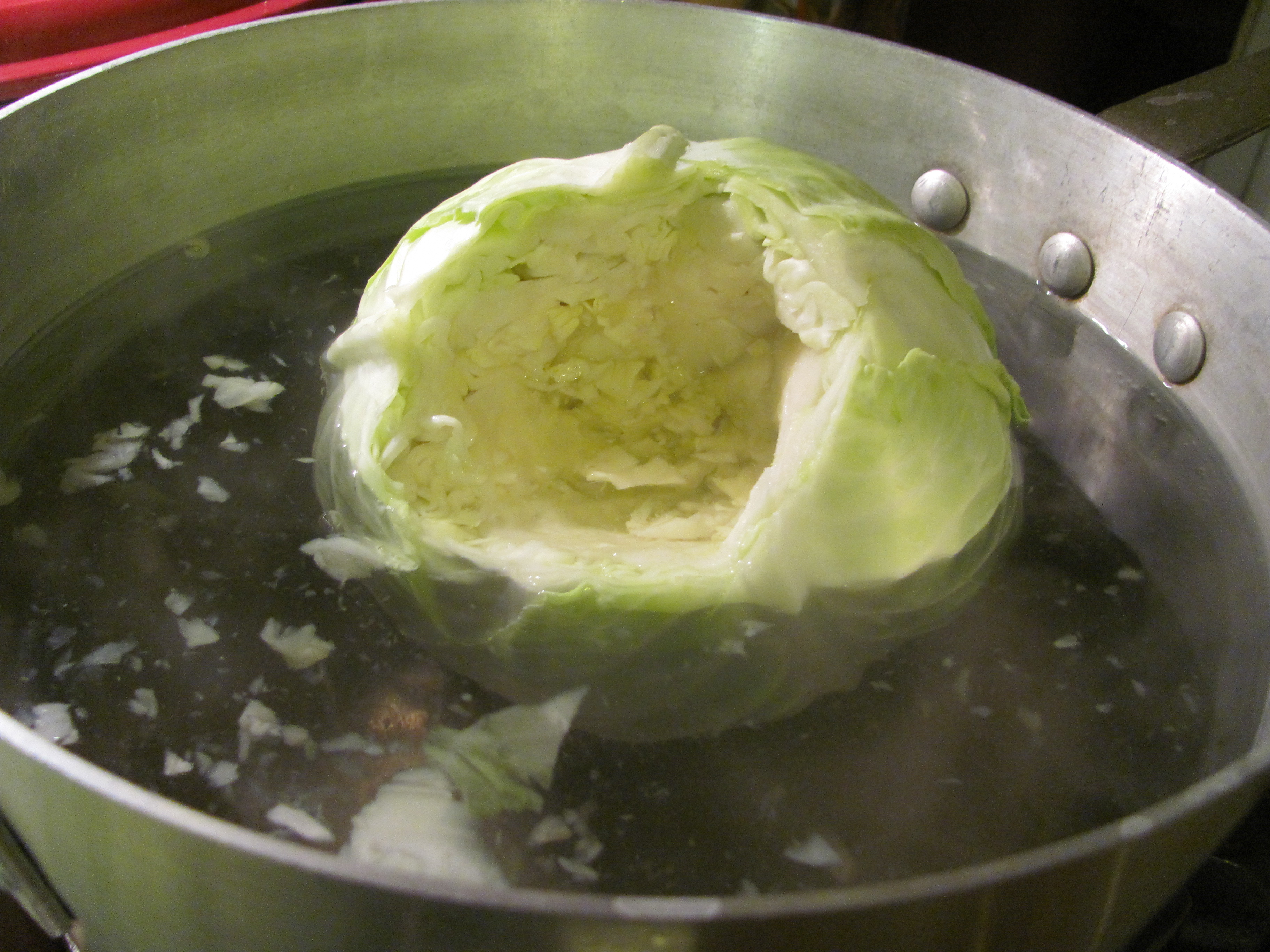 Remove center core of cabbage, and drop the whole head into boiling water;