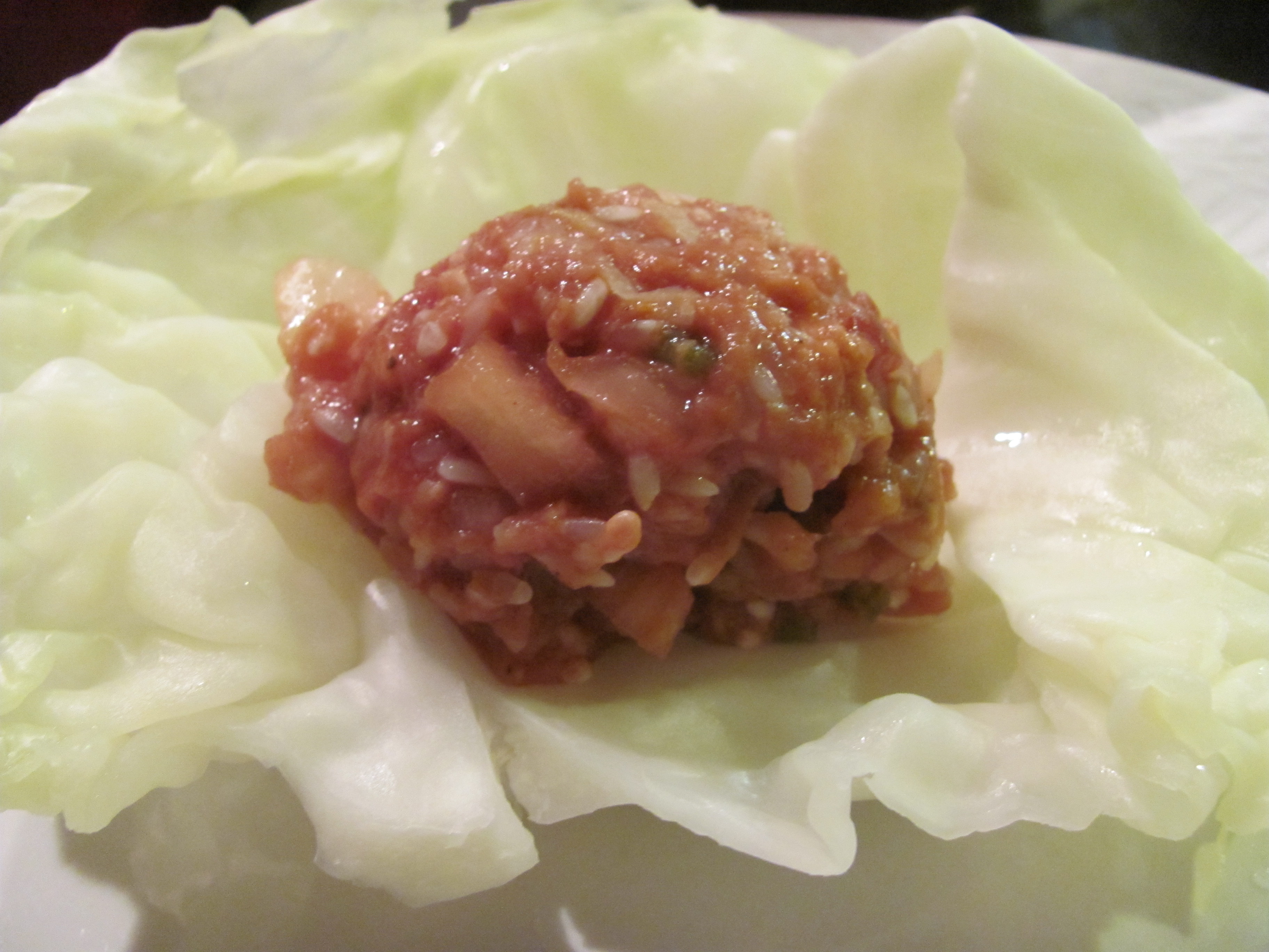 2 cups shredded par-boiled cabbage (use the center portions of the whole head of cabbage after removing the leaves that you will use for the rolls)