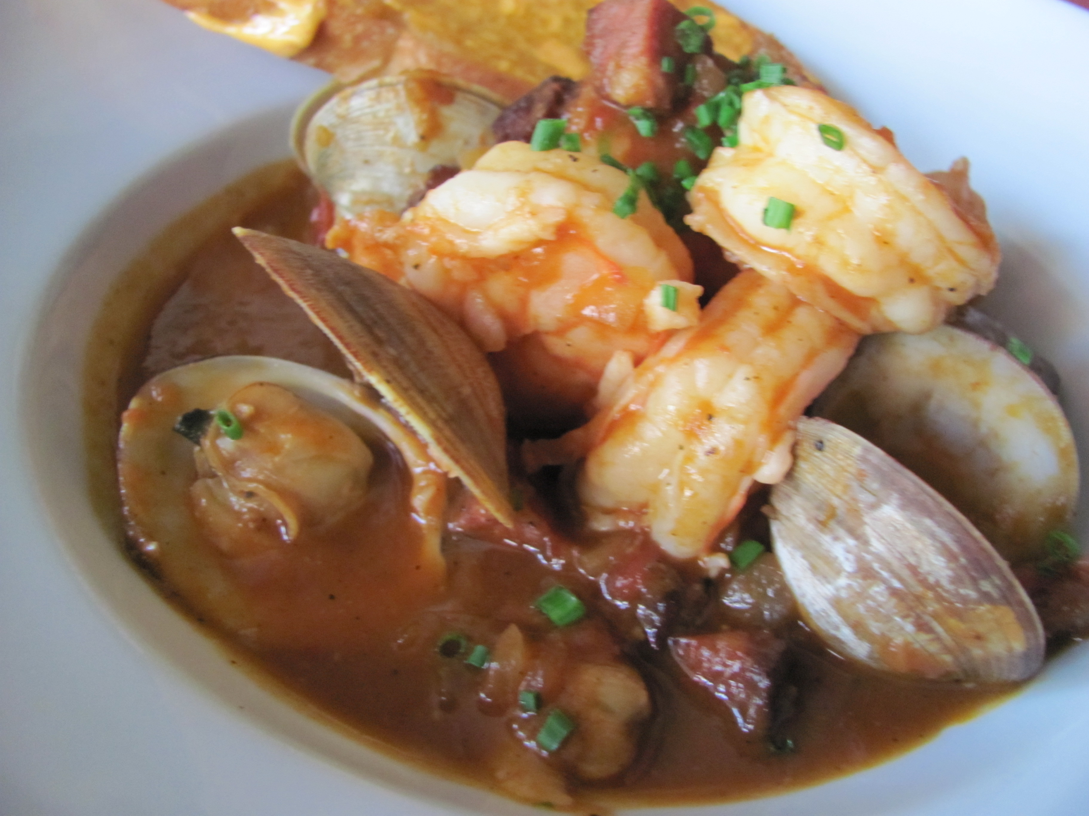 This is what Robert decided on….Just look at this bowl of deliciousness! I would call it Sylvain’s version of a bouillabaisse. The freshness of those gorgeous Jumbo Gulf Shrimp and wonderful Littleneck Clams…with the mild smokiness of the chorizo and faint hint of fennel and smoked paprika bathing in the rich tomato based broth – Oh my gosh!!! It was wonderful…and yes, I tasted this too – I just had to!