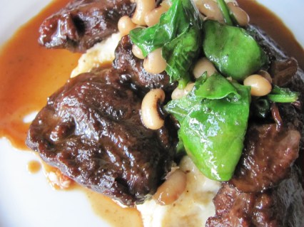 Braised Beef Cheeks with Potato Puree, Sweet Onions, Field Peas and Natural Jus: