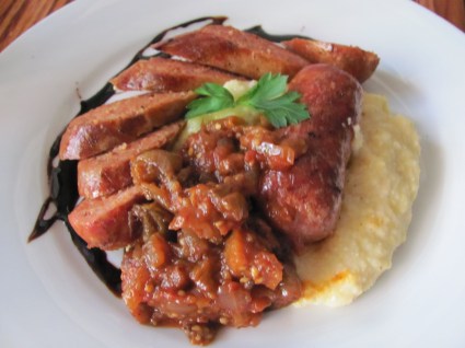 Grilled Italian Sausage with Louisiana Polenta, Stewed Eggplant and Balsamic Syrup: