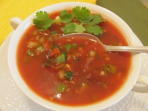 It was at the end of one of those long hot days, when I just had to have a cold soup…one that I could make and keep in the fridge for the week – to bring along to work for a cool light lunch (Maybe with one of those decadent tomato sandwiches!). With all of the tomatoes sitting on my counter and something had to be done with them!…a Gazpacho was the first and most logical soup that popped into my mind….