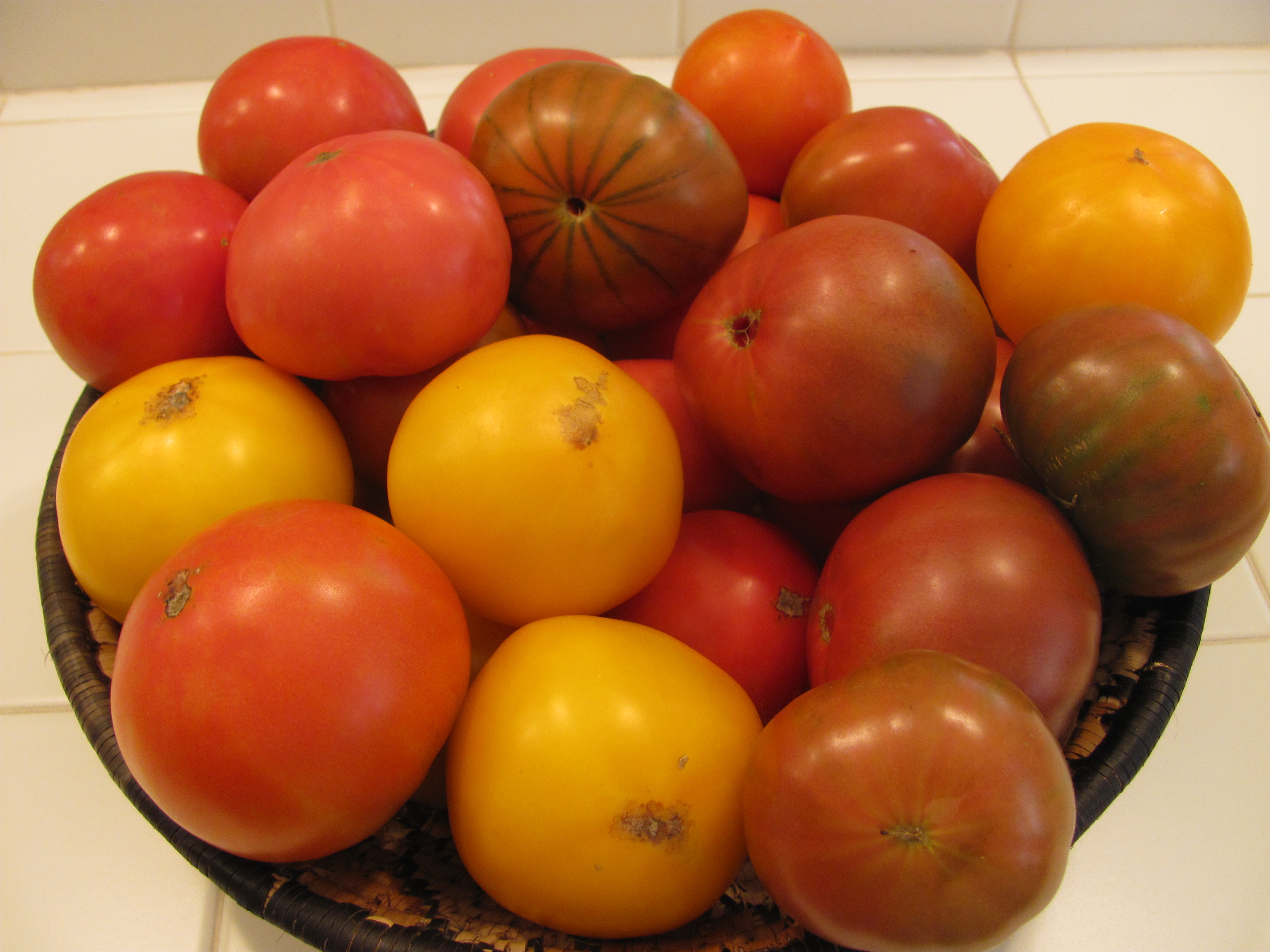 I guess it was in the peak of our “little drought” in June, when the tomatoes were at their peak…I was trying my best to keep the plants from frying in the sun and at the same time – trying to find (and invent) ways to use them all! That is when you are “up to your ears” in wonderful Heirloom Tomatoes of all colors – and if you have your own plants (and, of course, I always get carried away in early spring when it is time to plant!) you are finding every sunny windowsill lined and baskets on the countertops full of these juicy summer miracles.