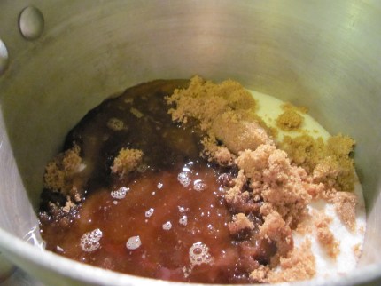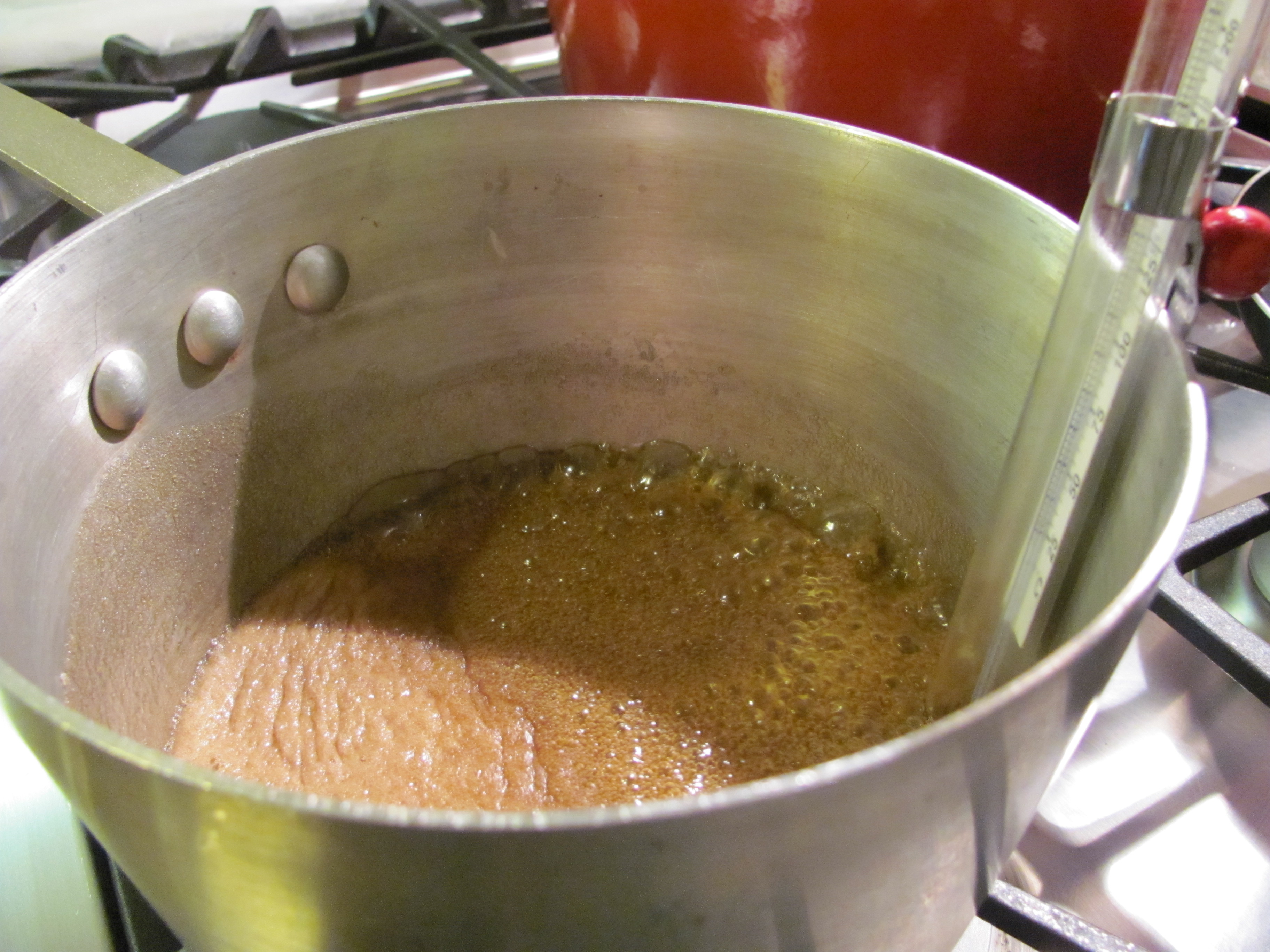 Attach candy thermometer to side of pot and cook until temp reaches soft boil, stirring often.  (Whatever you do – DO NOT taste, like I did today!  I now have a giant blister on my upper lip from the boiling sugar…Lord!)