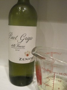 Heat wine, lemon juice and stock in a large skillet until coming to a boil.  Lower fire until liquids are just lightly bubbling.