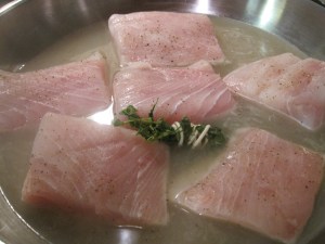 So, when my son walked in the house with a couple a huge, fresh and simply gorgeous slabs of Lemon Fish (also known as Cobia or Ling) that he caught on a fishing trip with my brother and nephews…I was thrilled – imagine that!  Immediately started thinking about the perfect way to cook this wonderful fish.  Not an oily fish, so I knew that I wanted to keep it clean and bright tasting – wanting to bring out the flavor, not hide it in a heavy sauce or batter.  Poaching – sounds exactly what we needed to do!  After talking about it with my “side kick – food guru” son, we knew that it would be fun and delicious…